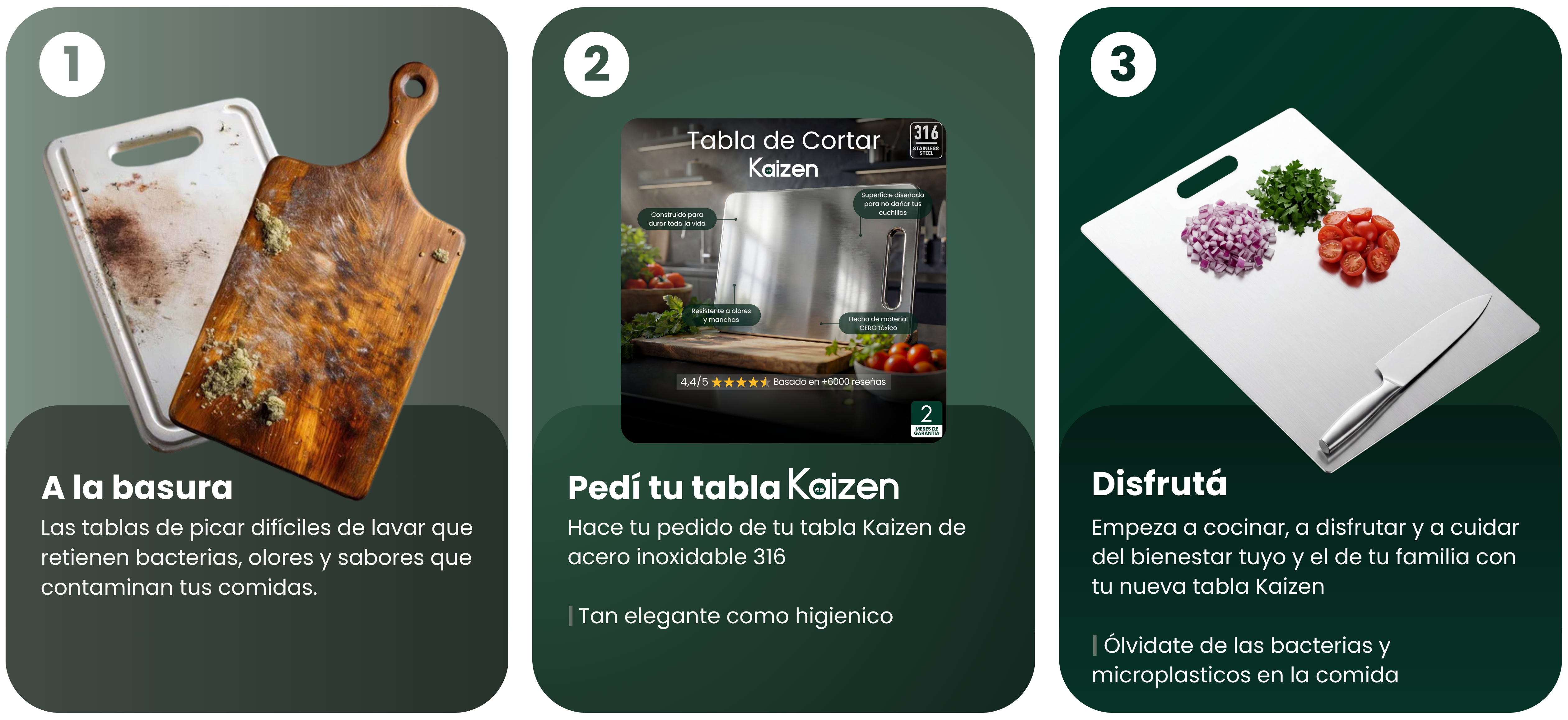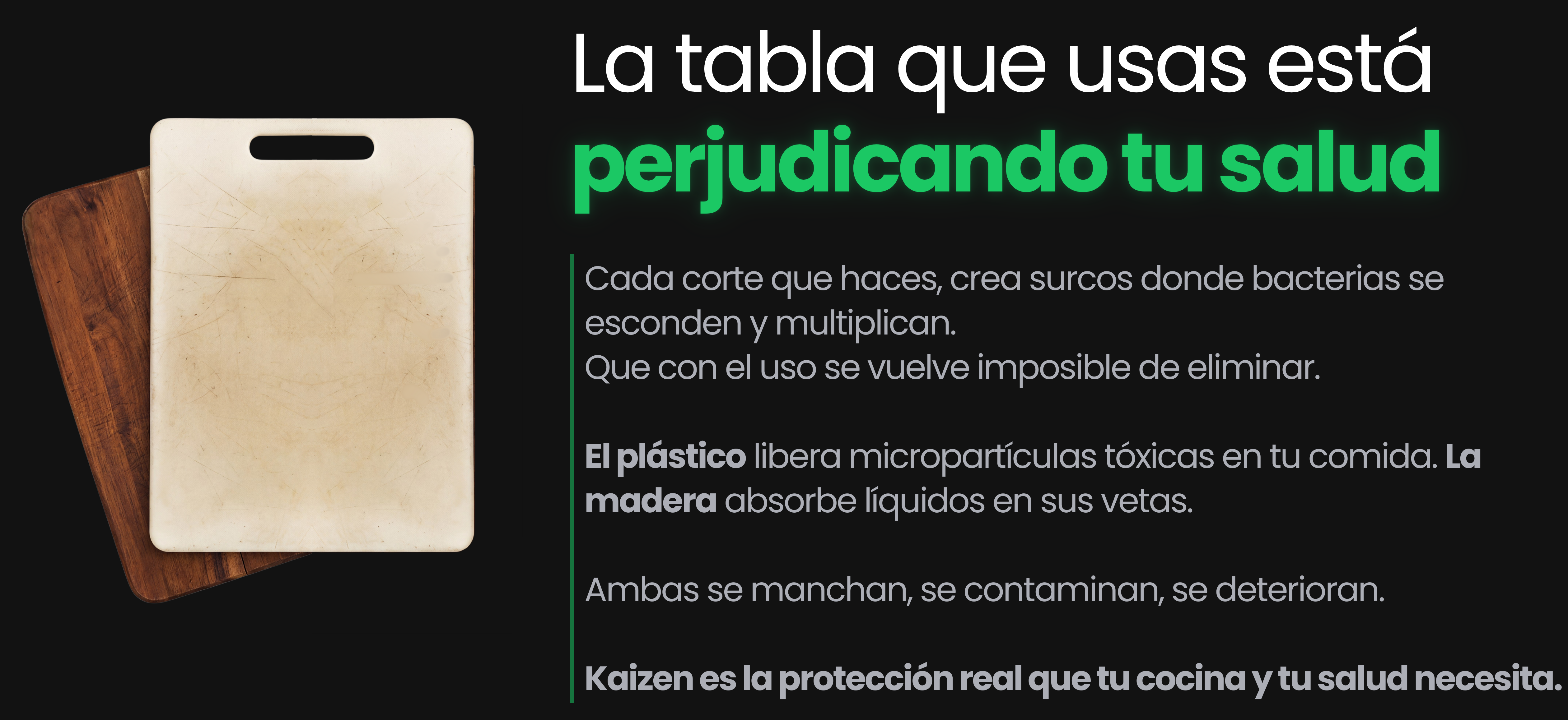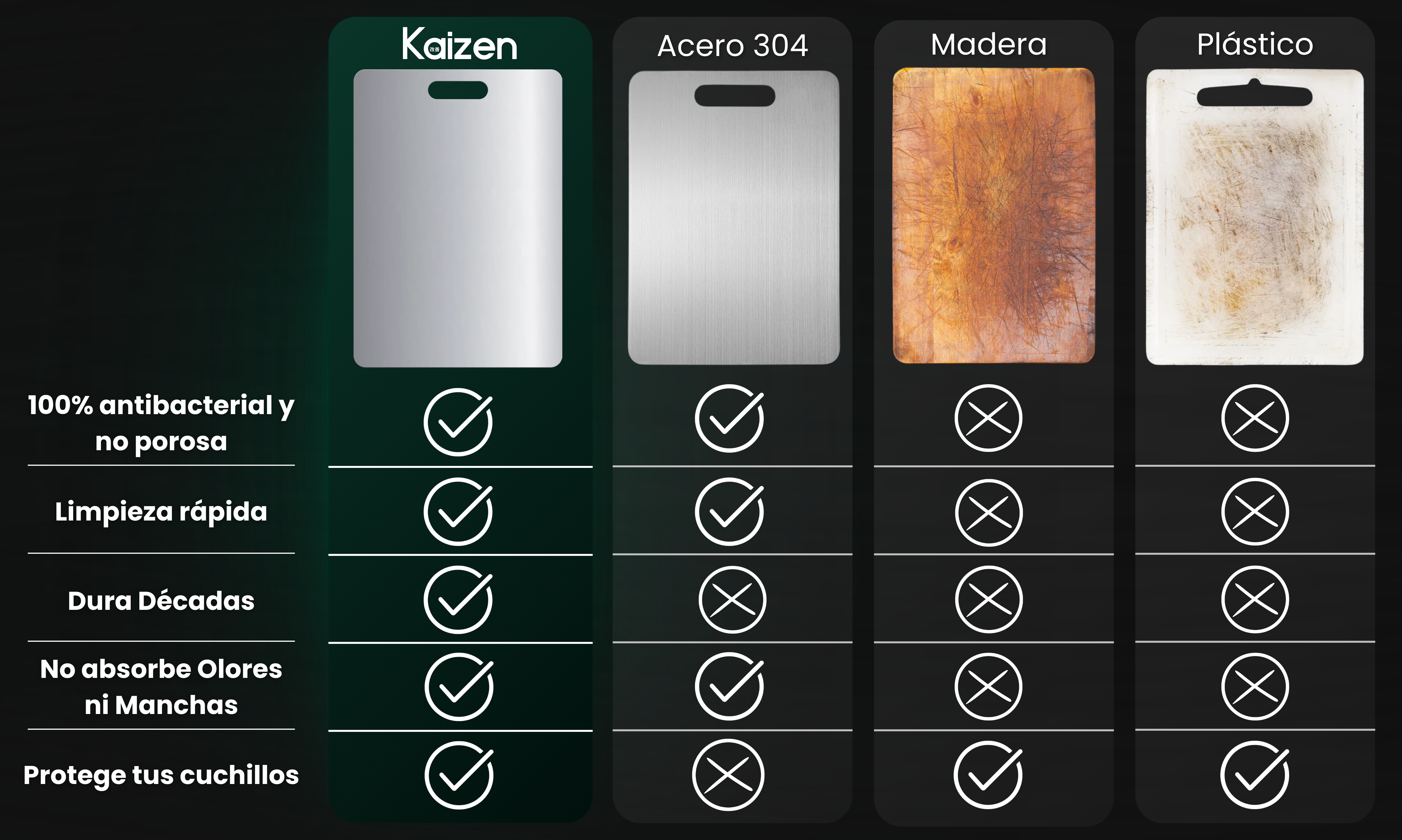 A diferencia de las tablas tradicionales, la tabla Kaizen no es porosa y no absorbe líquidos ni manchas.